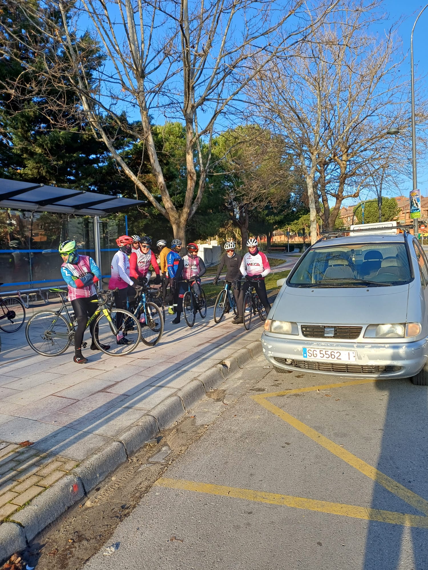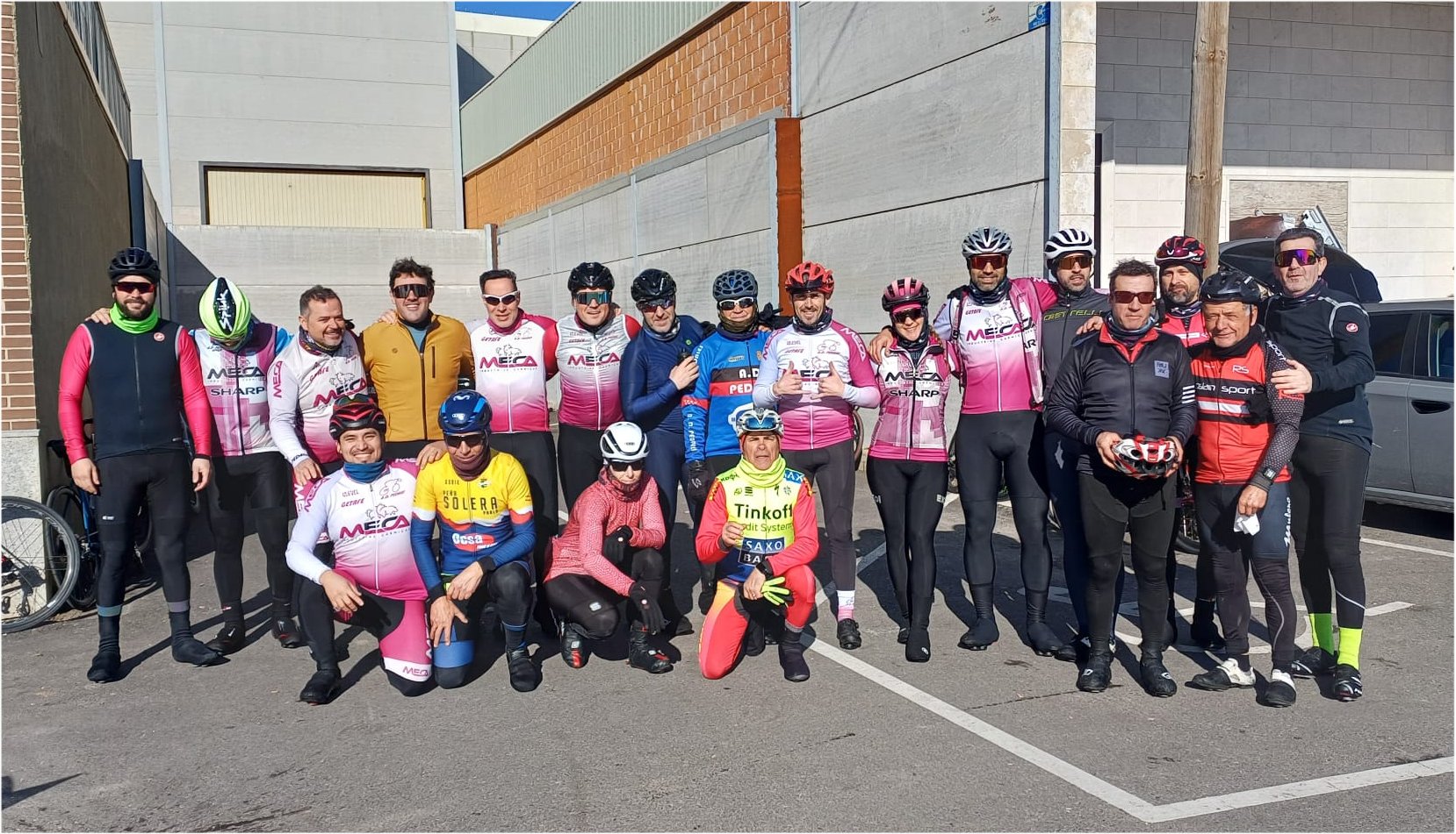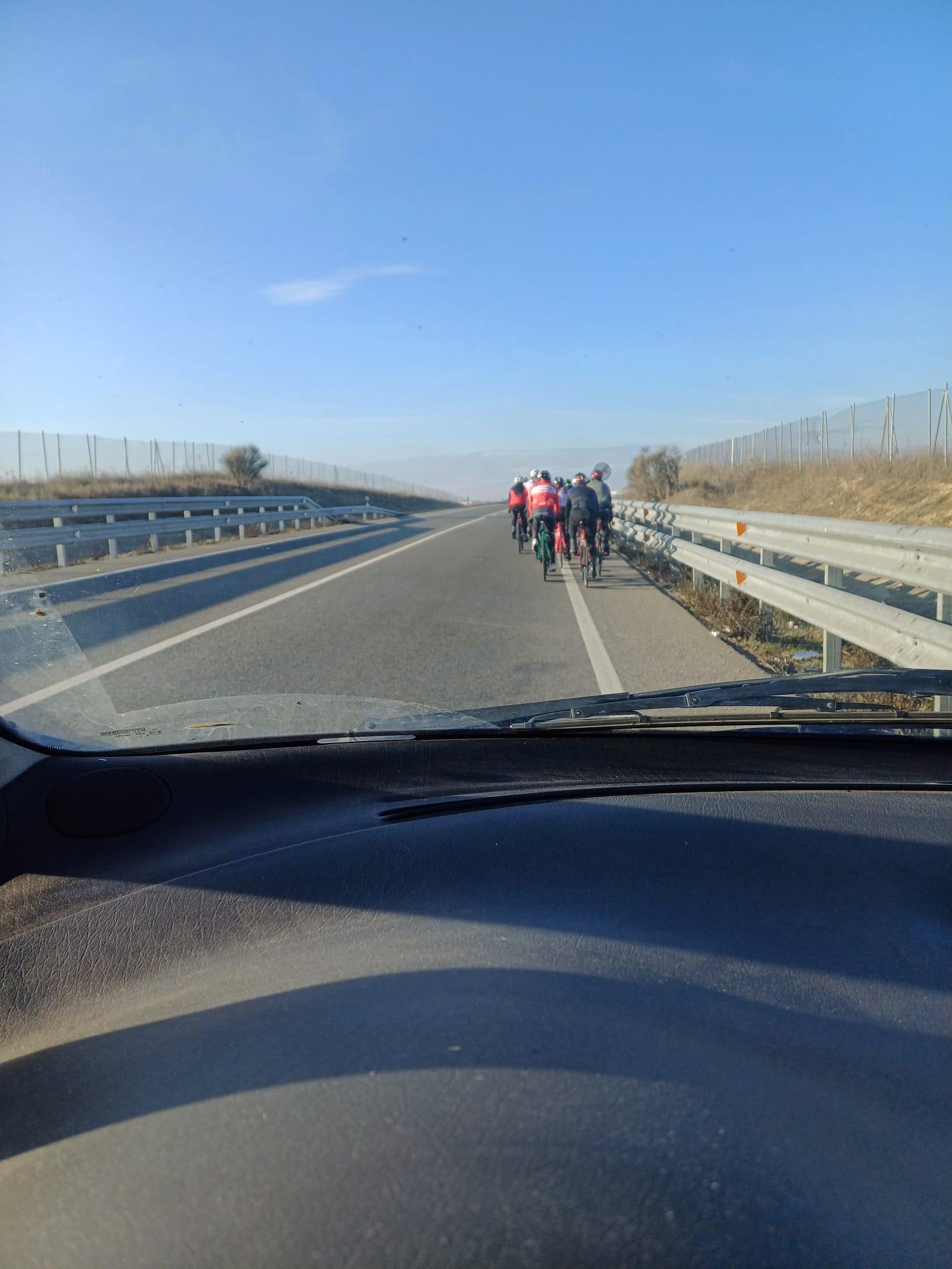 Desde Getafe, se avecinaba como siempre, un comienzo de etapa amistosa, comentando donde podría apretar uno y otro y zas, nadie lo vio venir, Eugenio cazando gamusinos al suelo; solo llevábamos 50 mts. de etapa y el primer abandono, sin percances físicos pero el cambio, al caer……. No ha podido seguir; nos alegramos de que no haya sido nada, pero la ruta debía continuar y así el grupo inicial avanza inexorablemente hacia tierras manchegas, recogiendo a los parleños en la sangre haciéndose el pelotón más pelotón que nunca.